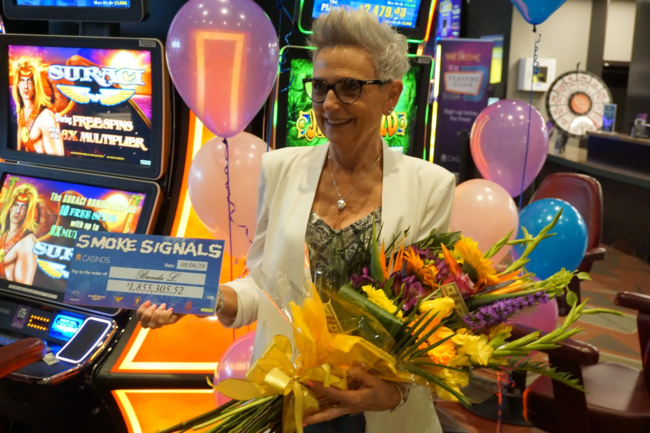 Brenda Lloyd won $1,855,305.52. Smoke Signals is a SIGA-wide progressive jackpot that links 51 slot machines at all seven casinos.