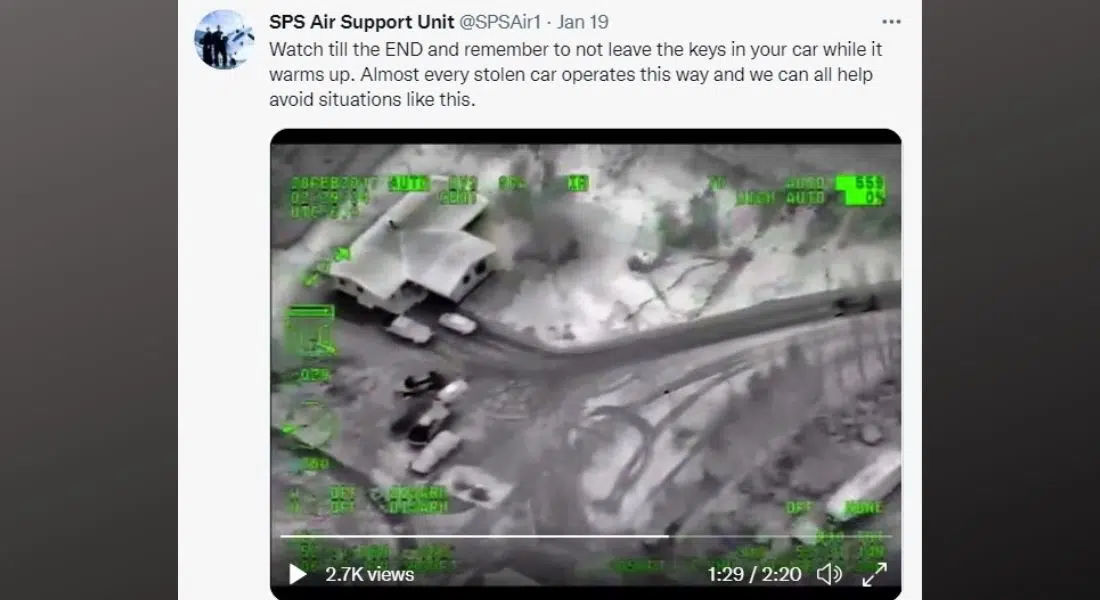 The Saskatoon Police Service Air Support Unit has posted a video on Twitter which gives a real life example of how easy it is for someone to steal a vehicle when the keys are left inside. The video shows the police plane guiding officers on the ground to an acreage where a vehicle is stolen in 12 seconds and then the suspect drives into oncoming traffic heading in the wrong direction. Police advise not to leave the keys in your car while it warms up, to help avoid situations like this.