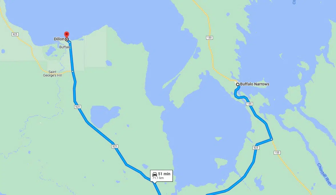 SaskPower reports 2,500 people are without power in Buffalo Narrows, Ile a la Cross, Dillon, and north up to La Loche. The fire burned underneath two kilometres of transmission that feeds several communities in the north. The power will be off until at least Tuesday or possibly later depending on conditions.