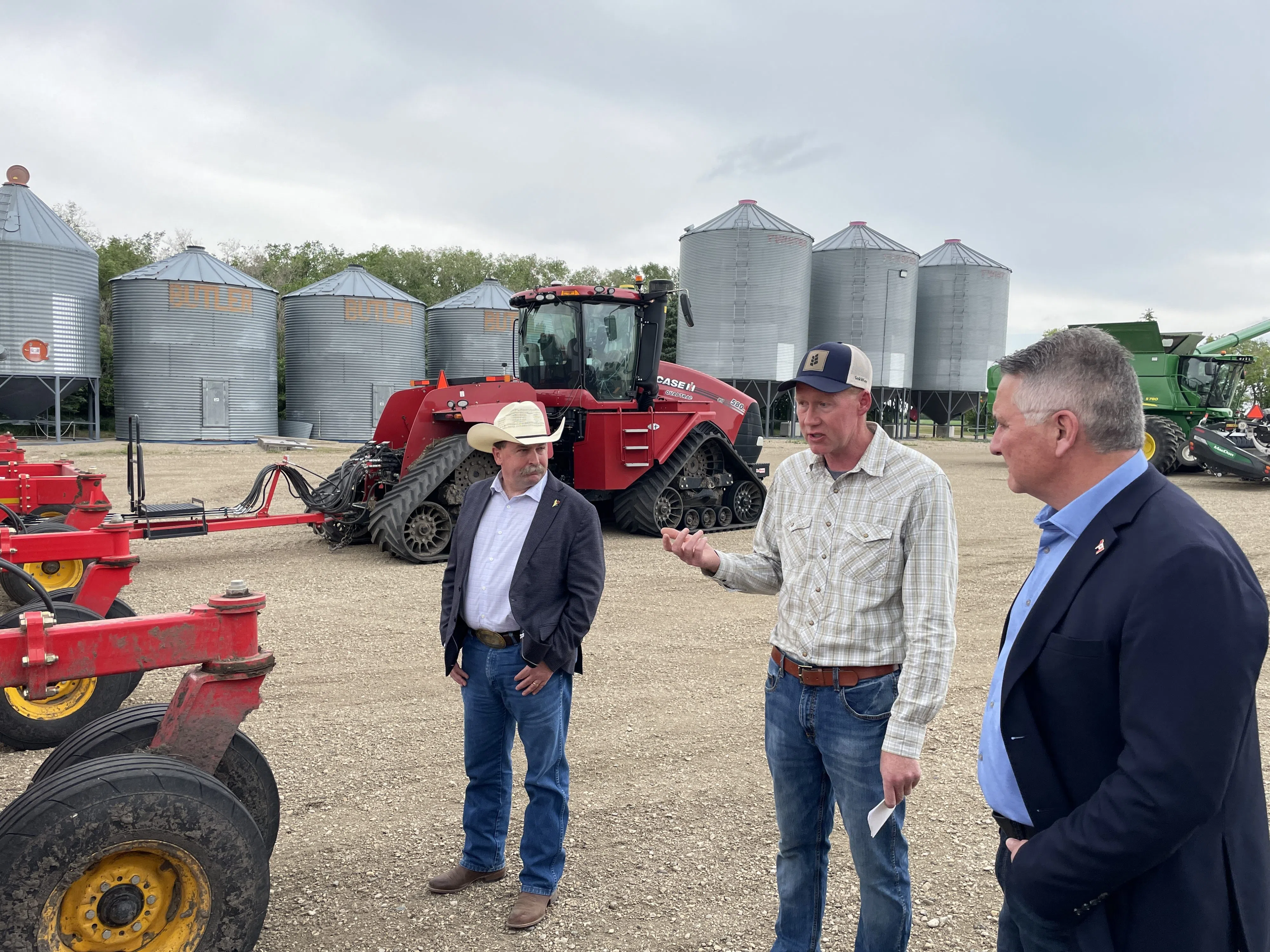 (both photos submitted and were taken in the Davidson area: above photo from left to right: Saskatchewan Agriculture Minister Darryl Harrison, Davidson area farmer and SaskWheat Director Rob Stone, Federal Agriculture Minister Heath MacDonald)