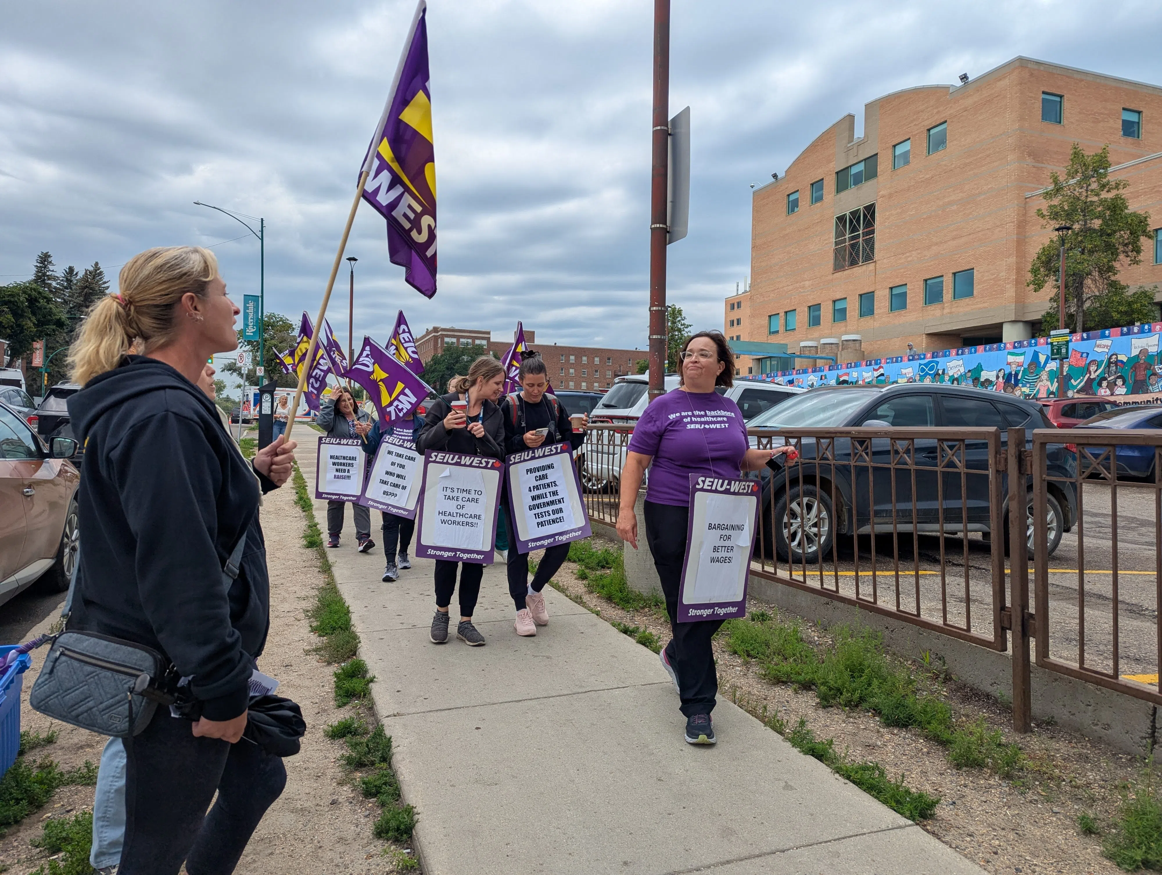 SEIU-West members held an information picket on August 7, 2025, at St. Paul’s Hospital in Saskatoon to educate the public about the state of the healthcare system. SEIU-West members say healthcare workers deserve a fair contract and that SAHO continues to decline their requests for a pay increase and better working conditions.