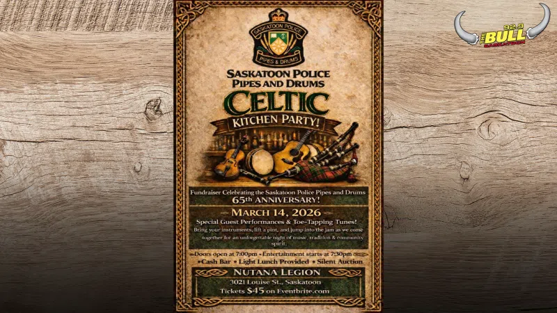 Shout out to Lisa Sands for dropping by the studio to talk about the Saskatoon Police Pipes and Drums 65th Anniversary Party on March 14. A good ol' fashioned kitchen party, sounds fun!